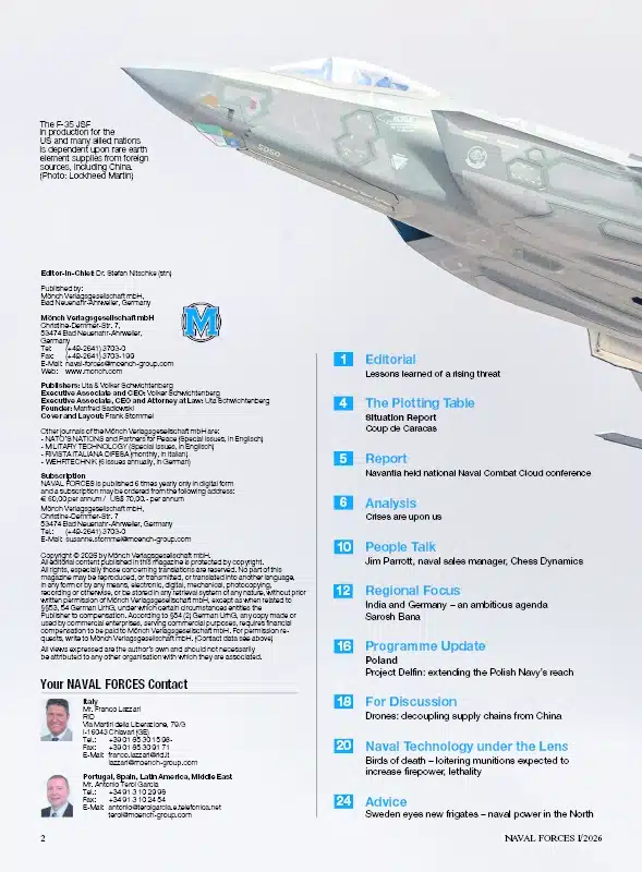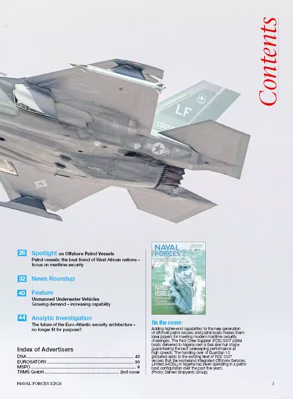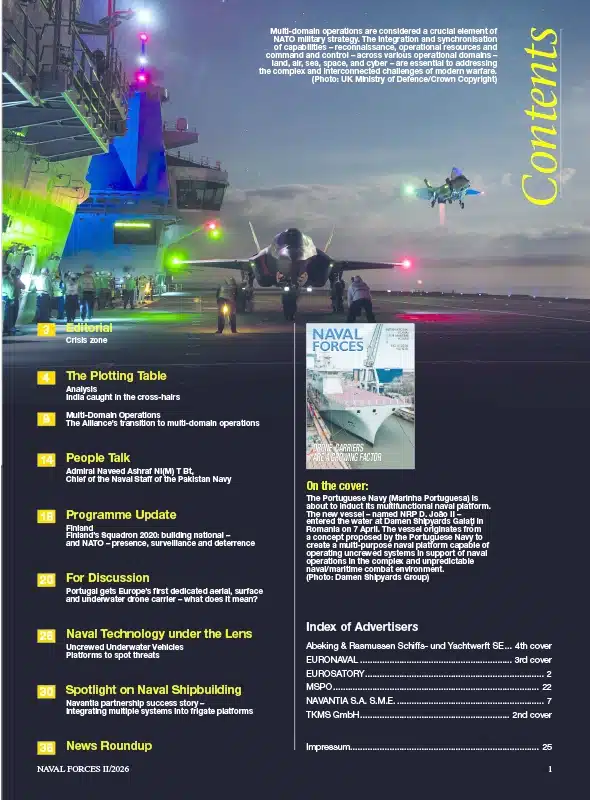 In line with the great success of NAVAL FORCES achieved over more than four decades, we decided to extend the reach of this leading international forum for maritime power. The first edition was published in January 1980. All regular editions and series issues are aimed at countries and shipyards, naval decision-makers with reference to NATO and naval policy. Addressing the demands of industry, governments and the Armed Forces, it provides its worldwide readership with exclusive insights into different navies’ maritime strategy, doctrine and procurement via exclusive analyses, features and interviews. Responding to strategic operational and technological shifts is always a major issue.